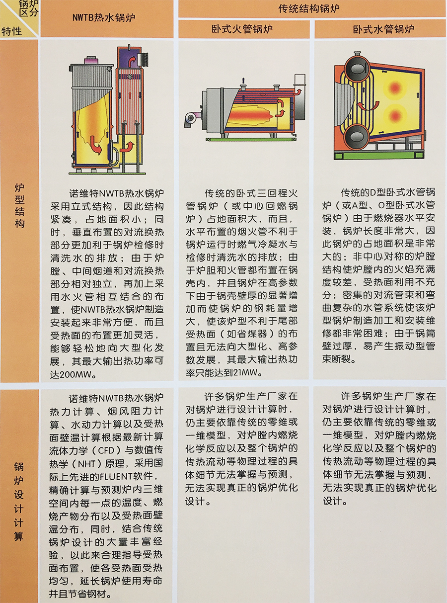 • before the 1970s, the convection heating surfaces at the rear of large gas or oil-fired hot water boilers in Finland were also in the form of serpentine tube tubes, a traditional structure based on the design of steam boilers.Results during the operation, it was found that the pipes of this structure were easy to be corroded, and no matter what measures were taken, the corrosion phenomenon could not be fundamentally reduced or avoided. Therefore, it was urgent to develop a new structure specially designed for hot water boilers to fundamentally solve the low-temperature corrosion phenomenon.Through a lot of research, the founder of novit in Finland developed the NWTB type hot water boiler, which subverted the structure of the traditional hot water boiler transformed from the coal-fired steam boiler, and the heating surface of the tail of the vertical arrangement of the hot water tube fundamentally solved the phenomenon of low-temperature corrosion.