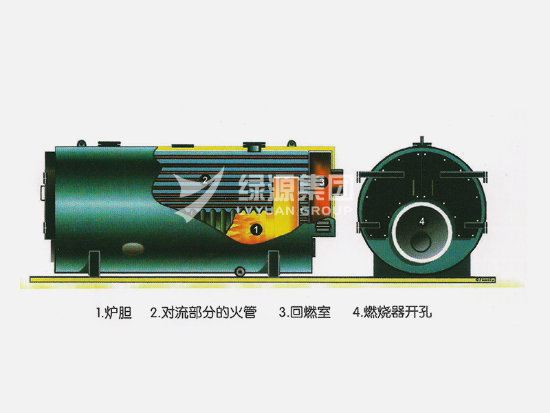 主要由鍋爐本體、冷凝器、燃燒器、控制裝置組件。鍋爐本體由爐膽、回燃室、煙管、鍋筒前后煙箱,彈簧式防爆門、保溫及護板、平臺扶梯等部分組成。