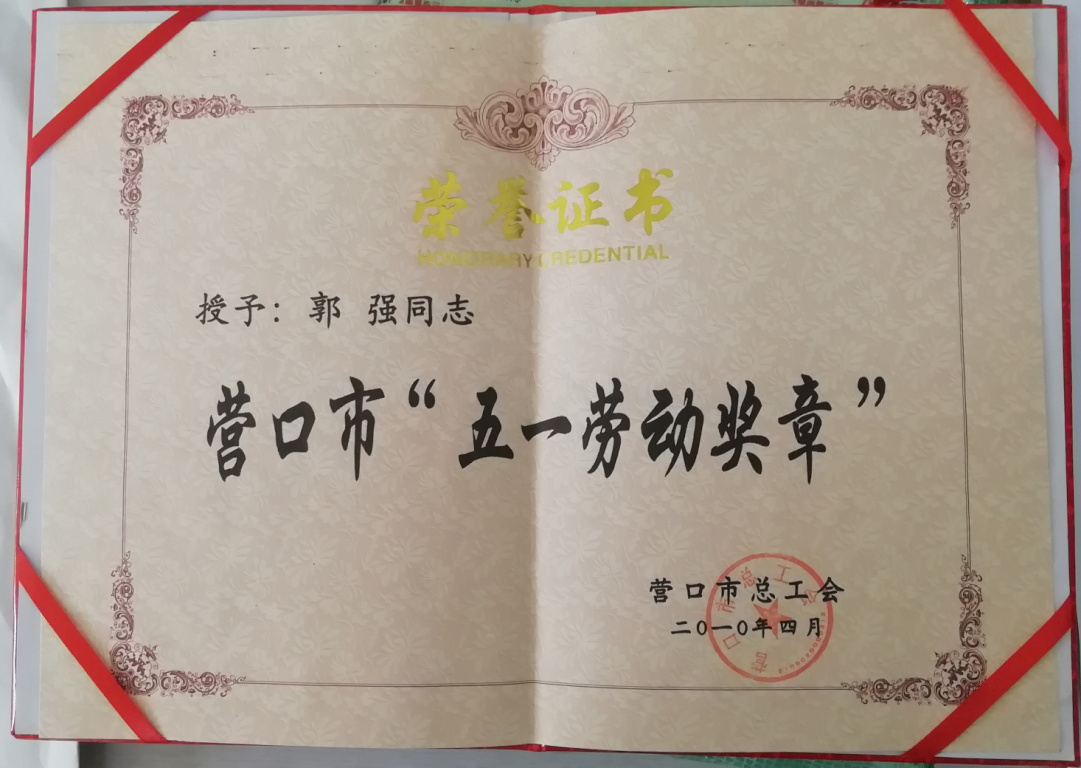 2.2010年4月營(yíng)口市總工會(huì)授予郭強(qiáng)營(yíng)口市“五一勞動(dòng)獎(jiǎng)?wù)?rdquo;。