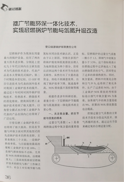 5.2017年3月我公司董事長(zhǎng)郭強(qiáng)在沈陽市供熱行業(yè)協(xié)會(huì)沈陽供熱行業(yè)內(nèi)部刊物中發(fā)表了“推廣節(jié)能環(huán)保一體化技術(shù),實(shí)現(xiàn)層燃鍋爐節(jié)能與低氮升級(jí)改造”的文章。