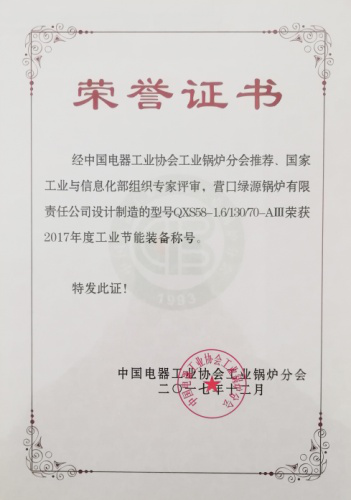 6.2017年12月經(jīng)中國(guó)電器工業(yè)協(xié)會(huì)工業(yè)鍋爐分會(huì)推薦、國(guó)家工業(yè)與信息化部組織專家評(píng)審,我公司設(shè)計(jì)制造的型號(hào)QXS58-1.6/130/70-AIII榮獲2017年度工業(yè)技能裝備稱號(hào)。