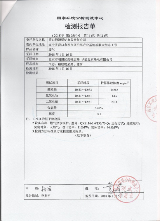 9、2018年1月華能北京熱電有限公司6×116MW燃?xì)獬瑑襞欧殴釞C(jī)組項(xiàng)目,經(jīng)國(guó)家環(huán)境分析測(cè)試中心測(cè)得氮氧化物14.9㎎/m³;二氧化硫N.D. ㎎/m³(低于檢測(cè)設(shè)備)。達(dá)到國(guó)內(nèi)最超凈排放水平。